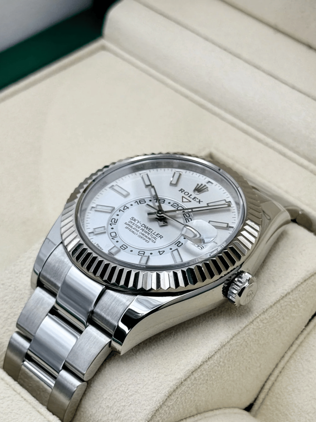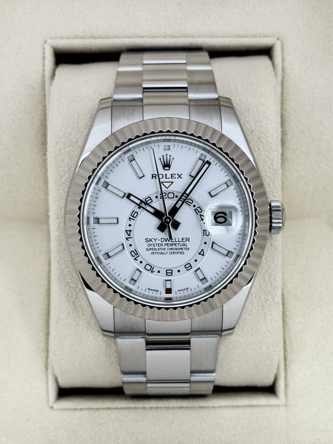 2018 Rolex Sky-Dweller 42mm 326934 Stainless Steel and 18k White Gold Fluted Bezel Oyster Bracelet White Dial