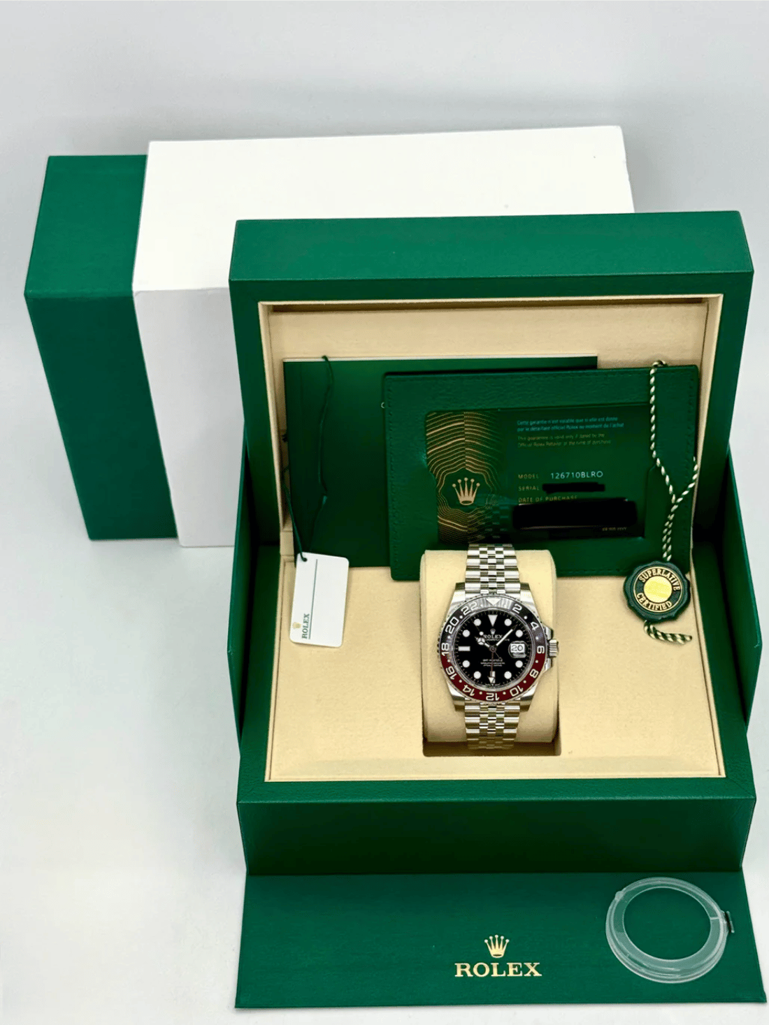 The Rolex GMT-Master II reference number 126710BLRO, features a 40mm stainless steel case, a red and blue “Pepsi” ceramic bezel, and a black Chromalight dial. It comes with a Jubilee bracelet and is powered by the Rolex Caliber 3285 movement.