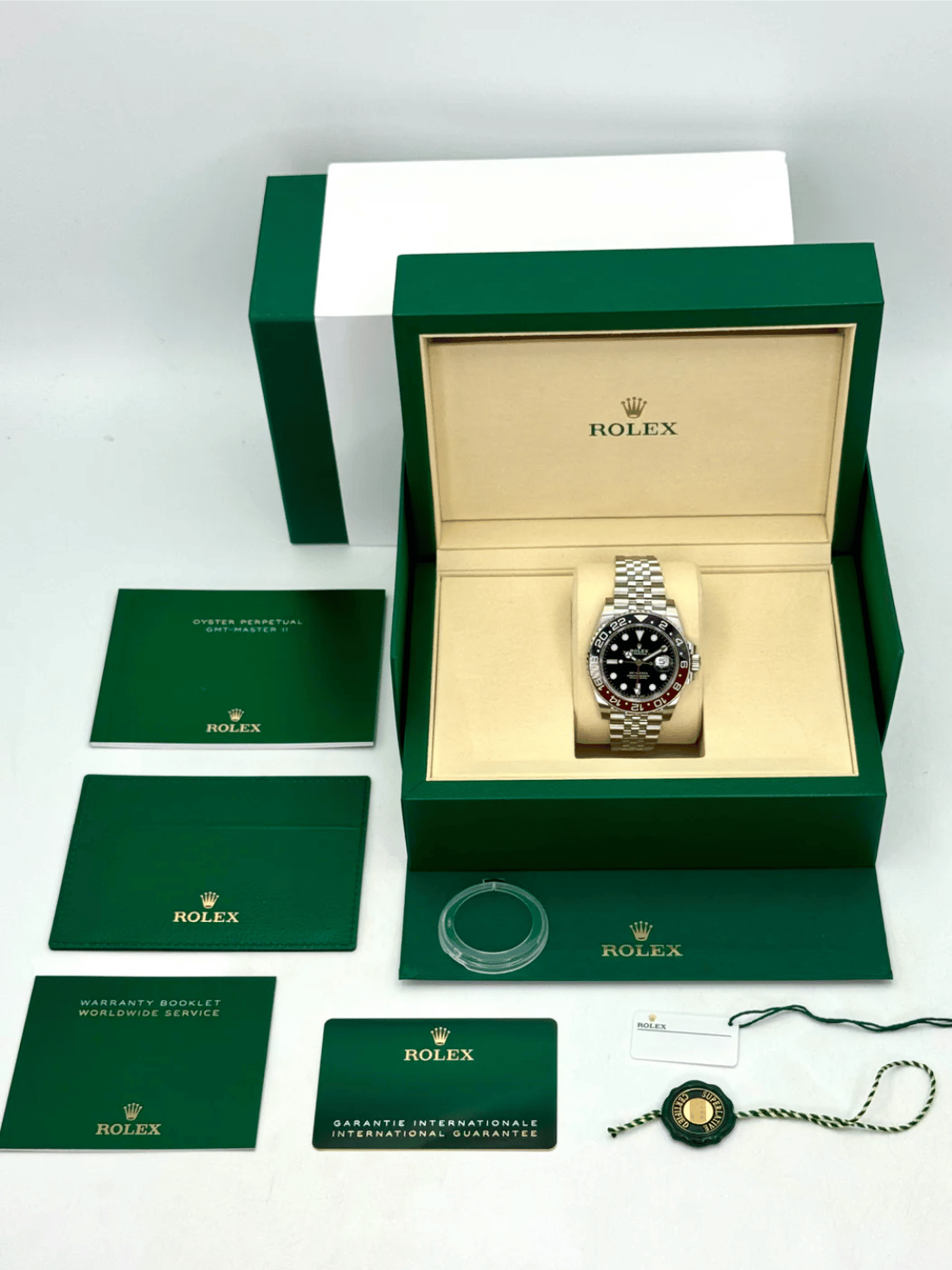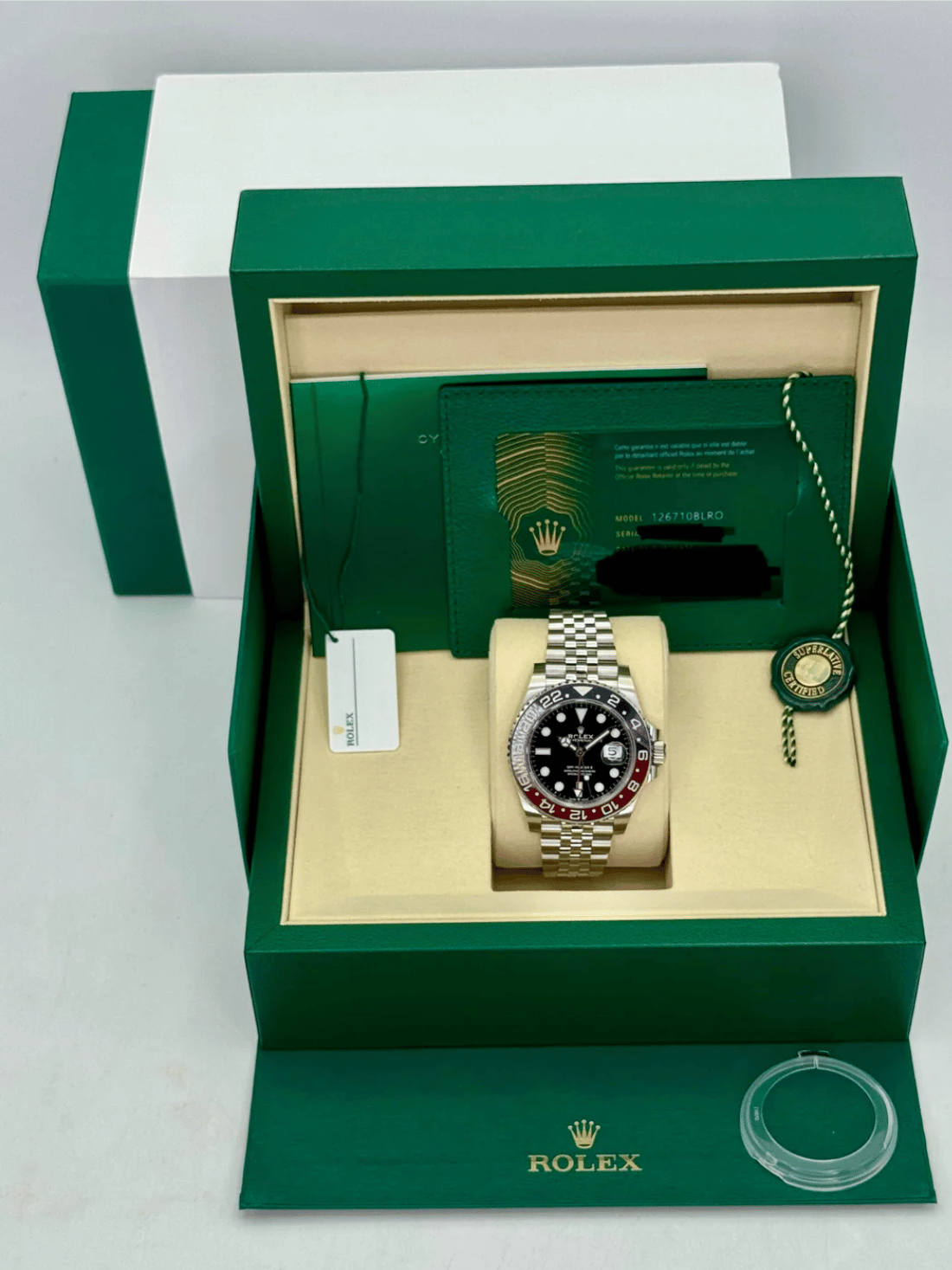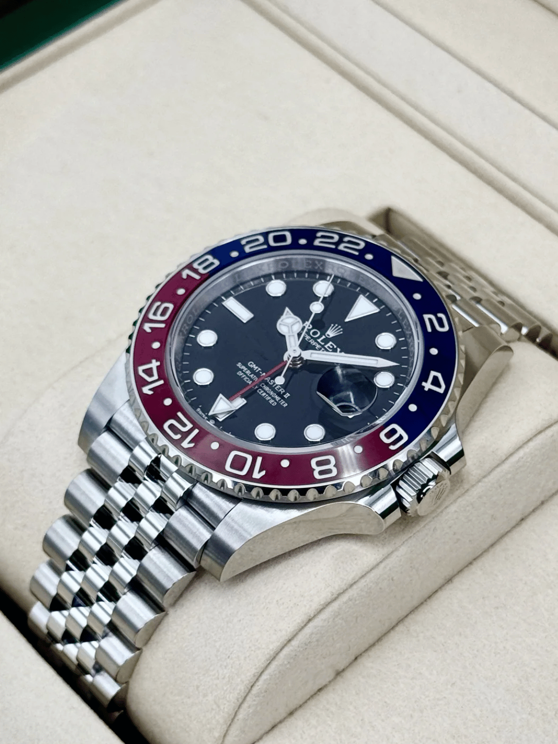 The Rolex GMT-Master II reference number 126710BLRO, features a 40mm stainless steel case, a red and blue “Pepsi” ceramic bezel, and a black Chromalight dial. It comes with a Jubilee bracelet and is powered by the Rolex Caliber 3285 movement.